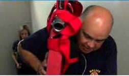 A cardiac patient and firefighter undergoes a personalized, real-life rehabilitation excise carrying hose up stairs.